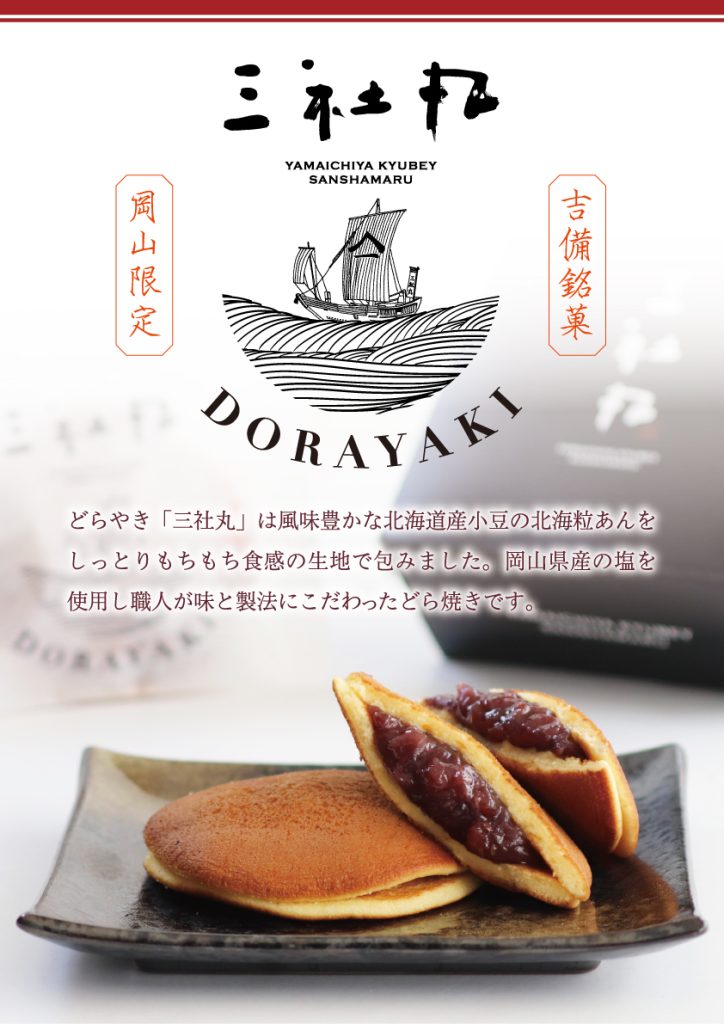 吉備サービスエリア上り線オリジナル どら焼き「三社丸」が、リニューアルいたしました。「三社丸」は天保10年頃、児島下津井の長濱を母港とし、実在していた北前船の船名です。北海道産の小豆、岡山県児島産の塩、鹿児島県産の鶏卵と、北から南まで主に国産の原材料を使用し、当時の北前船の面影を今に再現しました。開発チームが味と製法にこだわった、どら焼きです。