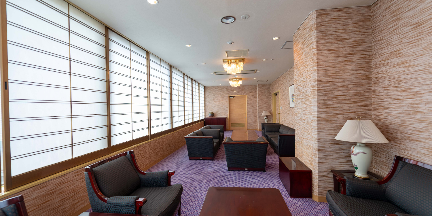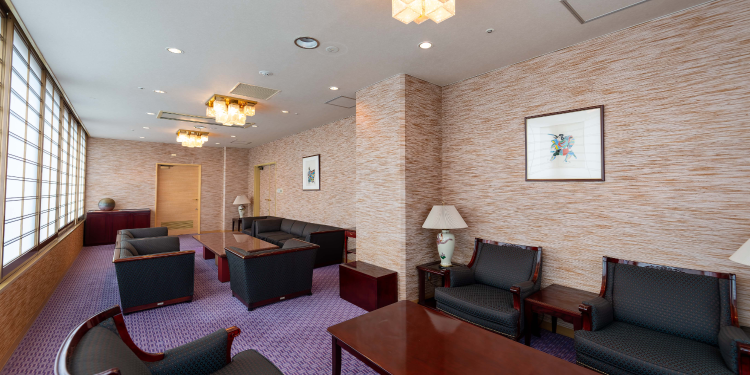 メイン4階「相生の間」。 重厚感あふれるテーブルに、包み込まれるような座り心地のソファ。 重要な会議や、大切なお客様をお招きする際の控室として最適です。