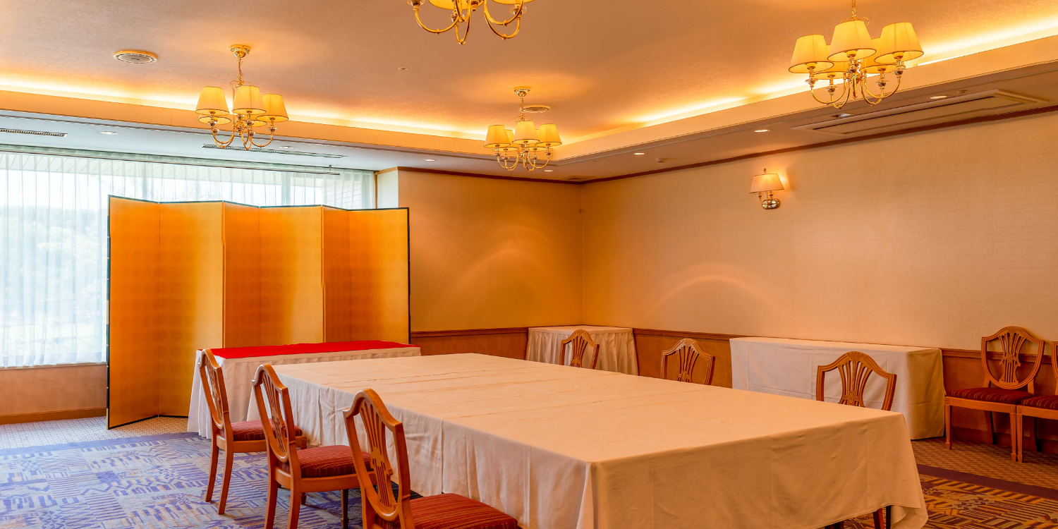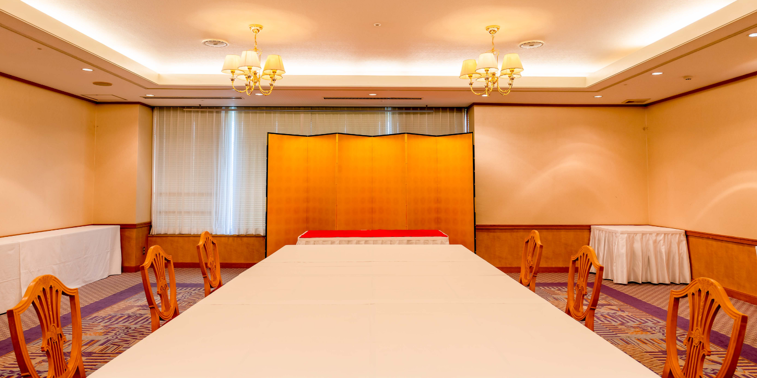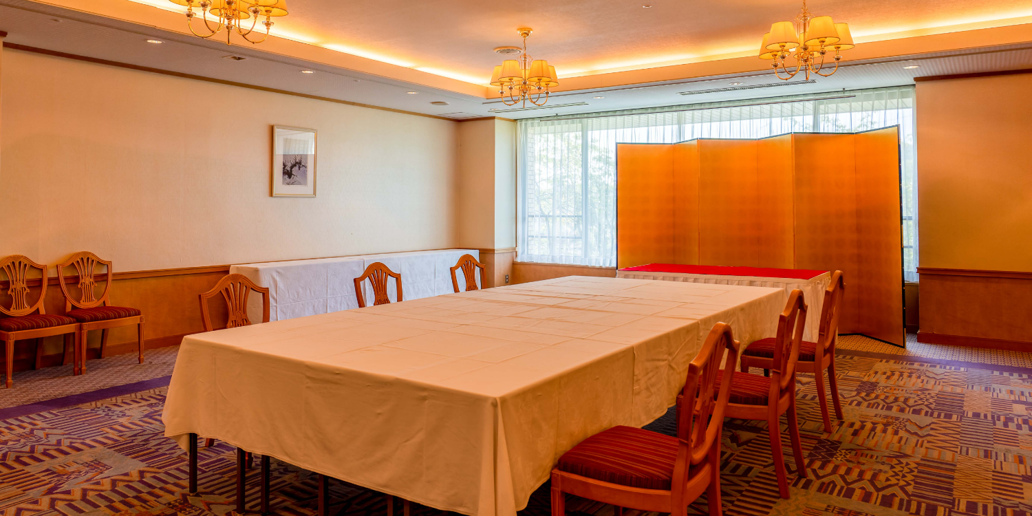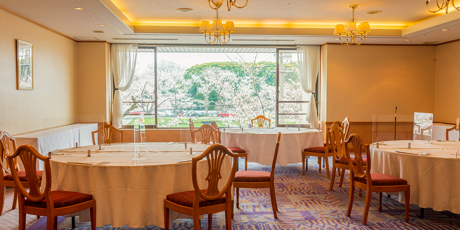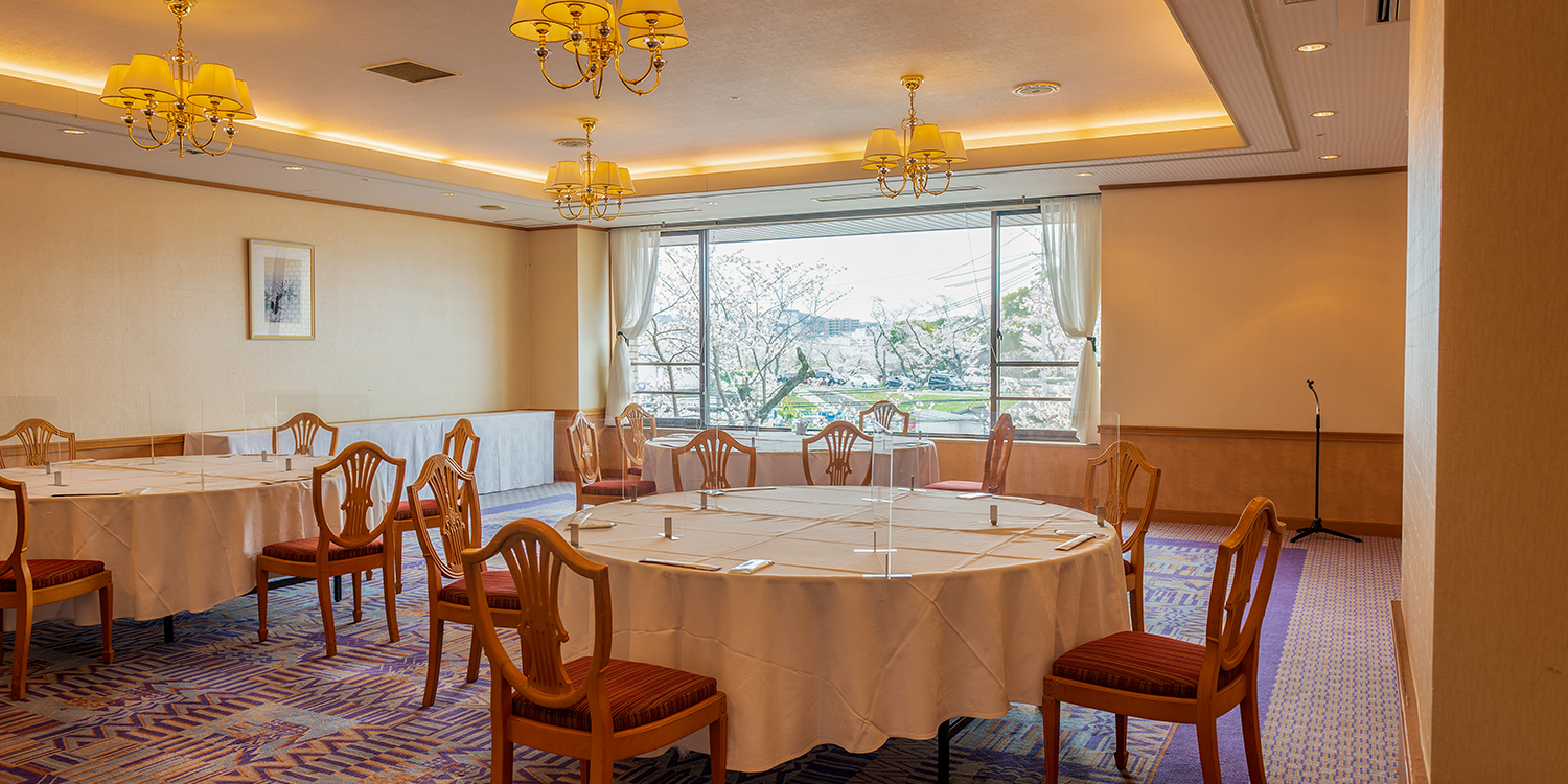 アネックス2階「曲水の間」。 小規模な研究会からご家族の食事会等、幅広くご利用いただけます。 桜の季節は、旭川さくら道沿いの桜並木をご覧いただきながらのご会食が最適です。