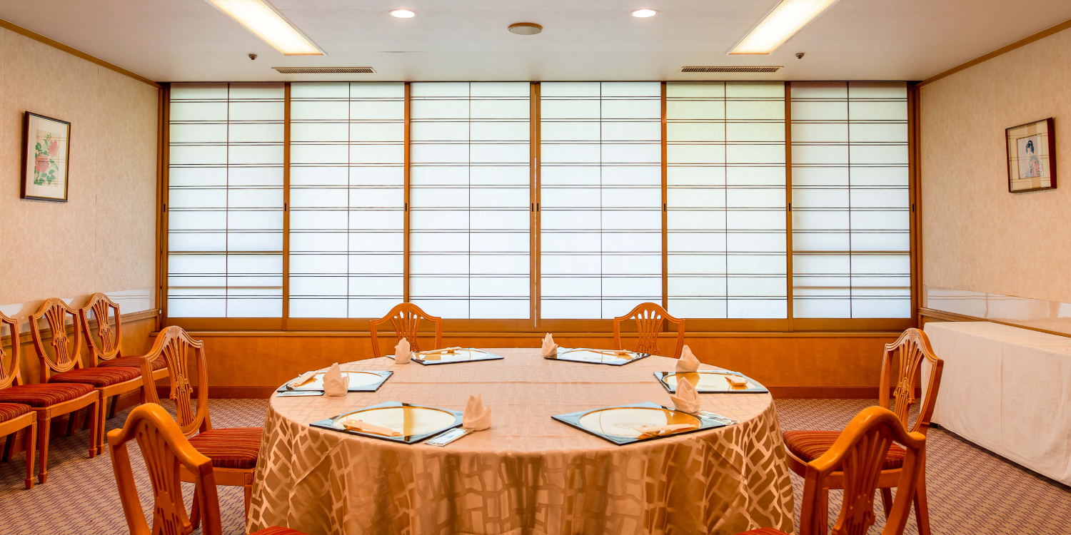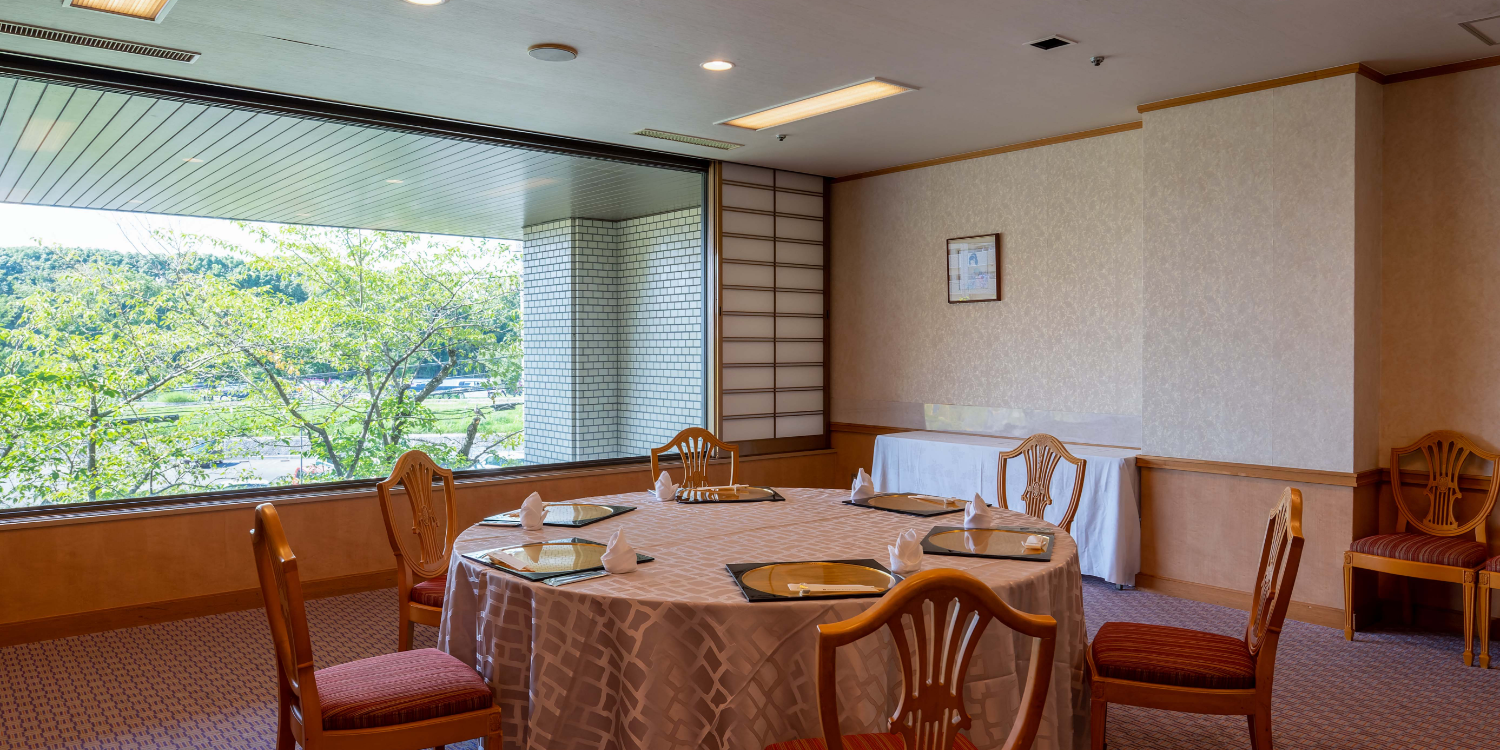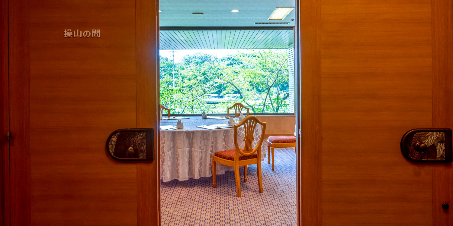 アネックス2階「操山の間」。 少人数のご会食、お顔合わせ食事会に最適です。 南向きの窓から桜の季節は、旭川さくら道沿いの桜並木をご覧いただけます。