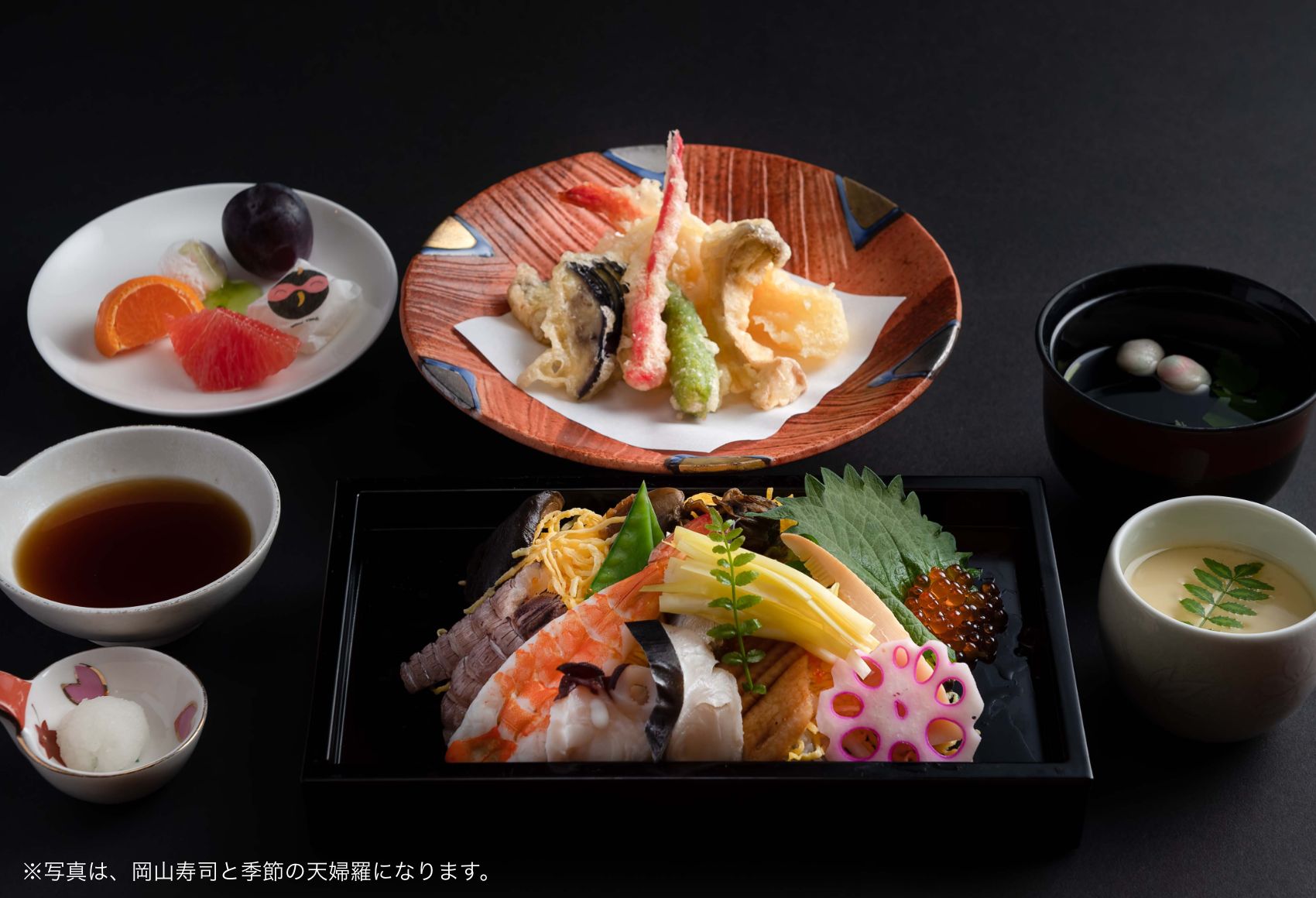 黄韮と岡山名産ちらし鮨(鰆・穴子・ママカリ・蛸・海老・シャコ・レンコン・竹の子 etc)/季節の天婦羅/茶碗蒸し/吸物/吉備団子と季節のフルーツ