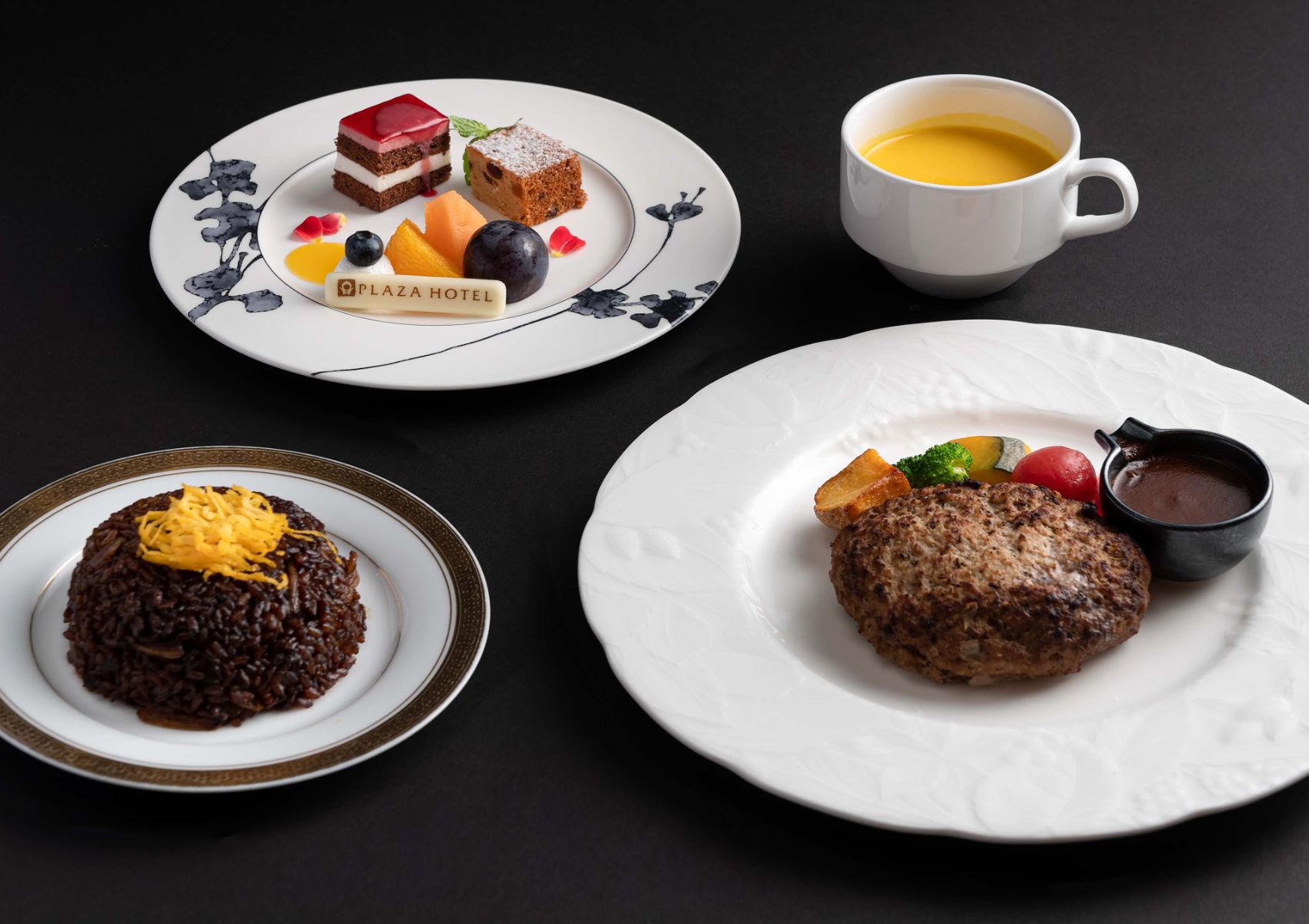 岡山野菜のスープ/岡山奈義牛ハンバーグ(230g)温野菜〜ホテルオリジナルデミグラスソース〜/岡山名物海老飯/ホテル特製デザートと季節フルーツ